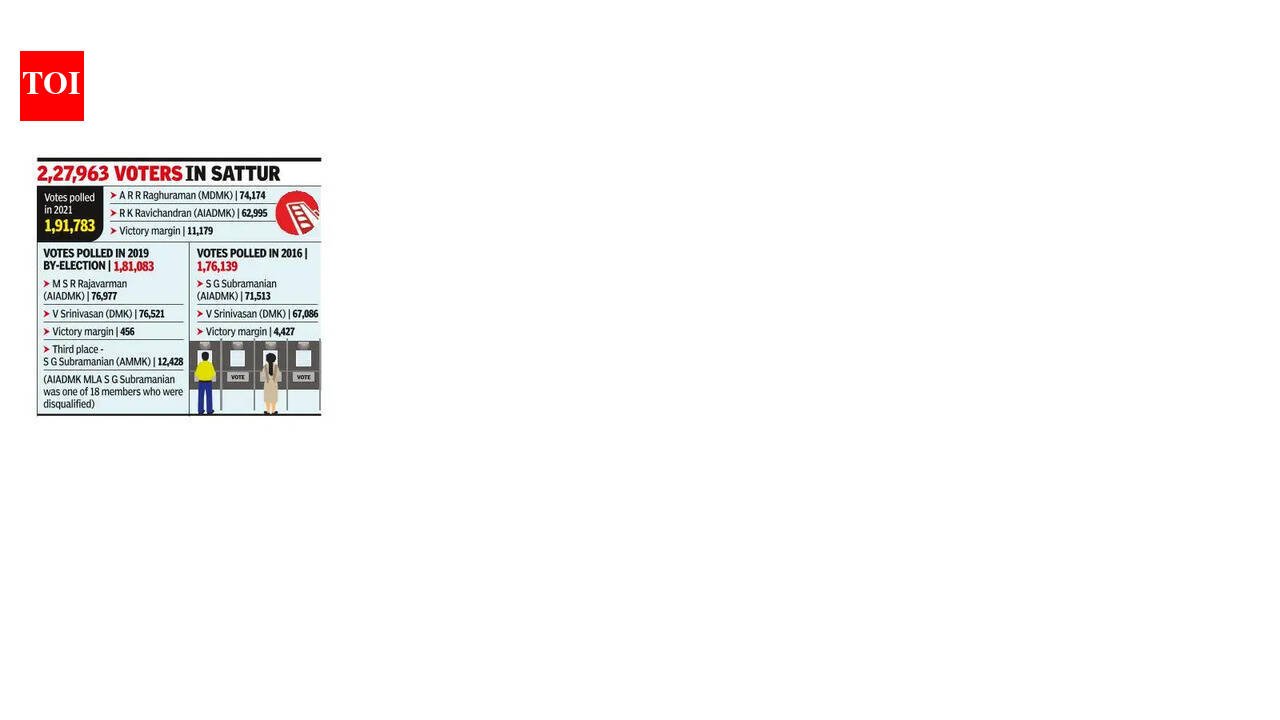 The DMK candidate is a familiar face in Sattur and its surrounding areas, being a party worker for 20 years. A party functionary who didn’t want to be identified said caste factor may not work in the constituency as it was local minister K K S S R Ramachandran’s stronghold. “He personally oversees works in the constituency, and villagers see him as an altruist,” he said. Kadarkarairaj, along with the minister has started meeting VIPs, business people and communal leaders to canvass votes. Past achievements and promises in the present manifesto are being publicised, he added. “Minister Ramachandran has resolved the drinking water issue under ‘Tamirabarani Integrated Drinking Water Scheme’. We started receiving water twice a day after this,” he added. BJP district treasurer M Marikannu told TOI that AMMK’s mukkulathor vote-bank would help BJP. “In the previous Lok Sabha election, BJP’s Raadhika Sarathkumar got 20,000 votes from that community alone in Sattur. BJP came first in nearly 10 booths and second in 50. Even if caste arithmetic works, we believe Union govt’s schemes will give us an advantage,” he added.AIADMK sources claim that the party, along with AMMK, had roughly 1 lakh votes. “Nainar has a great chance of winning and the anti-incumbency factor will stand him in good stead,” he added.