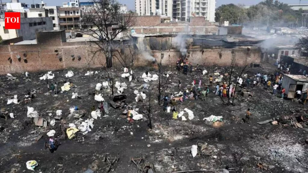 New Delhi: Rozina had almost escaped the fire, but she wanted to save her new Eid dress too. She went back into the burning jhuggi that was her home, and never emerged. The 17-year-old’s charred body was found later when the Delhi Fire Service put the flames out. In outer Delhi’s Rithala, the fire engulfed over 100 jhuggis on Thursday around 4.15 am. Rozina’s mother Aadina (38) wailed inconsolably. The girl’s aunt, Zarina (45), broke down while recounting how they lost her. “She had managed to step out when the fire broke out, but ran back in to retrieve a new outfit she had bought for Eid,” she said. Rozina’s younger sister has suffered burns on her feet.About 15 fire tenders and 75 fighters battled the blaze in the cluster near Rithala metro station and brought it under control by 7.25 am.In all, three people were reported dead in two fires that broke out in Delhi’s Rithala and Paharganj, where two labourers were killed.DFS officials said a cardboard and paper godown in Rithala may have fuelled the blaze. The fire also spread to a gasket factory adjacent to the cluster, which had a large quantity of scrap. Residents said that before the fire on Thursday morning, the cluster had seen only minor fires, never any disaster of such a scale.In the jhuggi, Shabnam (12) and Meera (13) sat with the charred remains of five puppies they had fostered. They also held burnt pages of their school books. Neither of the girls could appear for their exams on Thursday. Last Nov, a fire had broken out in another jhuggi cluster nearby. Two people had died in that blaze.On Thursday, govt officials on the spot said shelter would be provided to the people, but residents said that they did not want to leave the area for fear that the scrap they could salvage and sell might get stolen.Some residents had broken the jhuggis with rods and hammers and even jumped over adjoining houses to escape the flames. “Many people were injured in the chaos. Some also suffered burns,” said factory worker Sameer-ul (22). The residents said the fire started near the entry gate of the settlement. They alleged foul play. Police said a probe was on to ascer-tain what caused the blaze. A case was filed at the Budh Vihar police station.In another incident, two labourers were found charred to death after a fire broke out inside a toy godown in central Delhi’s Paharganj on Wednesday evening.The fire started on the first and second floors of a four-storey building around 4.37 pm and spread to the third floor. A temporary structure had been erected on the terrace of the third floor, where the charred bodies were found. Fifteen fire tenders with about 75 personnel put out the blaze. Plastic and rubber used in the toys seemed to spread the fire. It was brought under control by 3.20 am.Delhi Fire Service officials said that during the operation, some angry local people and labourers threw stones at the firefighters. One official said, “Out of anger, they threw stones and even broke the window of one of our vehicles.”Officials said the situation calmed after police intervened. A probe is under way to ascertain the cause of the fire and establish the sequence of events.