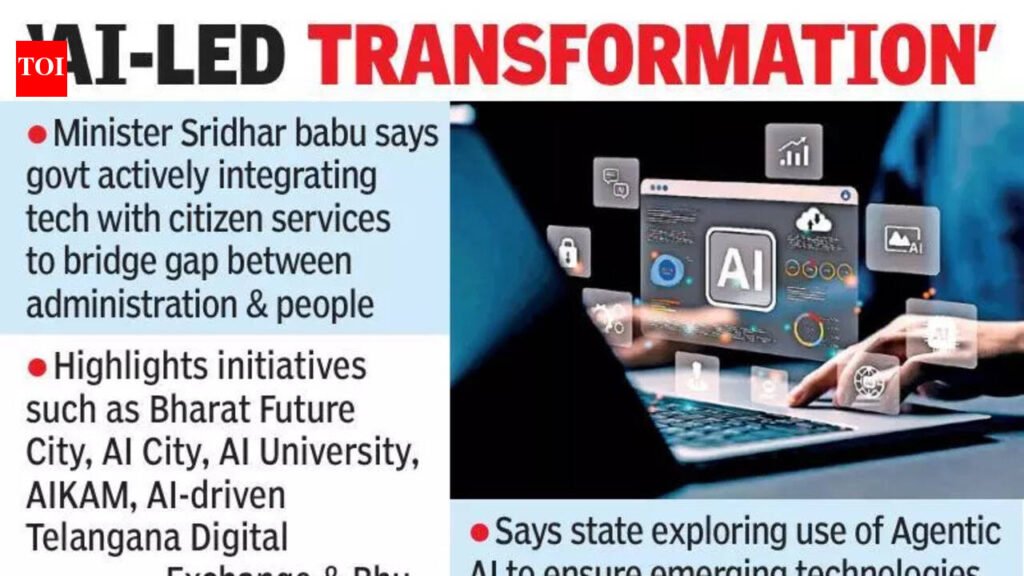 Hyderabad: Telangana hopes to emerge as a role model for digital governance by leveraging artificial intelligence (AI), quantum computing and blockchain to improve public service delivery, IT and industries minister D Sridhar Babu said on Friday.Addressing a session titled ‘Agents of Change: AI for Government Services and Climate Resilience’ at the India AI Impact Summit 2026 at Bharat Mandapam, New Delhi, the minister said technology is being positioned as a core transformational tool under the Telangana Rising 2047 vision. The govt is actively integrating technology with citizen services to bridge the gap between the administration and the people, strengthen last-mile delivery, and reduce misuse in welfare programmes.He highlighted initiatives such as Bharat Future City, AI City, AI University, AIKAM, the AI-driven Telangana Digital Exchange and Bhu Bharati, stating that they would reinforce the state’s digital governance framework. Emphasising inclusive innovation, he said Telangana is exploring the use of Agentic AI to ensure emerging technologies benefit all sections of society. He added that the state is expanding technology adoption across agriculture, climate resilience, healthcare, sustainable urban development, clean energy and disaster management.In another session with Swedish trade representatives and global technology stakeholders, he pitched Telangana as a treasure trove of opportunities, describing its vast talent pool as its greatest strength. He said Telangana has a strong and dynamic talent pool capable of driving impactful research and innovation in AI.The minister told the gathering that the Telangana govt, under chief minister A Revanth Reddy, is preparing for rapid AI-driven changes in job roles through skilling and reskilling initiatives. He said AI research centres, applications and service ecosystems would create new employment opportunities and urged youth to seize them.He also pointed to a large-scale push to provide internet connectivity to every village, with T-Fibre working over the past two years to connect rural areas. He described Telangana as a “haven for investment,” citing a pro-innovation ecosystem, uninterrupted power supply and a stable policy framework.