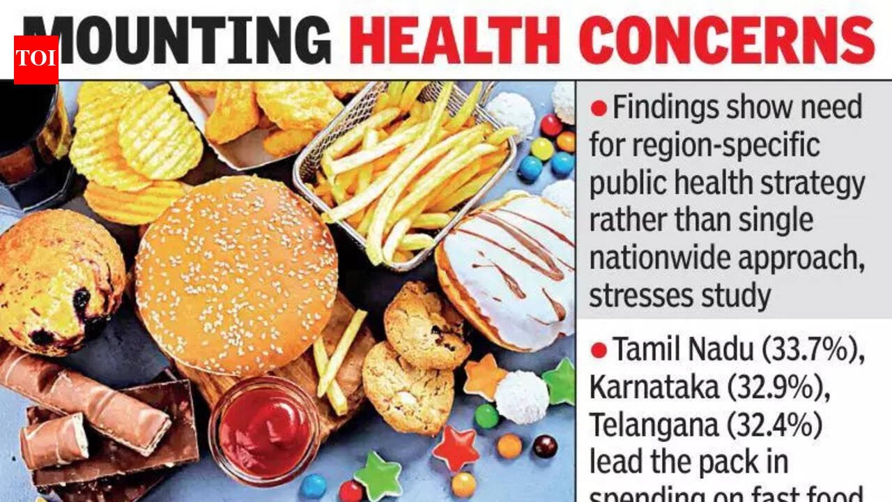 Hyderabad: People in Hyderabad and other urban hubs of Telangana, as well as in the southern states of the country, are spending a third of their monthly food budget on fast food, leading to a sharp rise in type-2 diabetes in the region.This has been brought out in a recent study ‘FADIS (Fast-food Attributed Diabetes Index Study)’ published in the Indian Journal of Medical Research (IJMR) of the Indian Council of Medical Research (ICMR). It was taken up by doctors from Mayo Clinic, USA, and the Siddhartha Medical College, Vijayawada.The growing spend on fast food has led to a massive rise in consumption of ultra-processed foods (UPFs) in Telangana, Tamil Nadu, Karnataka, Kerala and Andhra Pradesh, the authors say.For both urban men and women, the study has found a significant link between spending on fast food and diabetes rates. In rural areas, however, the correlation was weaker, which doctors attributed to lower access to junk food outlets and different lifestyle patterns.To break it down, on average an individual spends between Rs 1,000 and Rs 1,450 per person monthly on UPFs from the total Rs 4,120. It includes industrially prepared, ready-to-eat or ready-to-heat meals, snacks and beverages that are typically high in refined carbohydrates, added sugars, unhealthy fats and salt.The study warns that these states are at the forefront of a ‘nutritional transition’ where traditional diets are being replaced by energy-dense and processed foods. Tamil Nadu tops chart, Telangana thirdAmong the 18 states analysed for per capita spending on fast food, all southern states ranked at the top. Tamil Nadu recorded the highest share of spending on fast food, followed by Karnataka and Telangana. In comparison, several northern and northeastern states reported UPF consumption rates below 15%.Identifying Telangana as a high-risk zone, the study says Hyderabad and other urban areas are already seeing health impacts, with diabetes prevalence reaching 3.8% among urban men, one of the higher rates recorded in the study.Among women, the study identifies excess weight and obesity as the single most significant risk factor for diabetes. In fact, obesity levels among women in the southern states were found to be much higher than the current prevalence, indicating that a large population could be at risk of developing diabetes in the future.The study stressed that the findings highlight the need for gender-focused and region-specific public health strategies, rather than a single nationwide approach. With fast-food spending in Telangana nearly three times higher than in some northern states, the researchers recommended targeted nutrition awareness campaigns, urban food policy reforms and community-level interventions to reduce the consumption of ultra-processed foods.