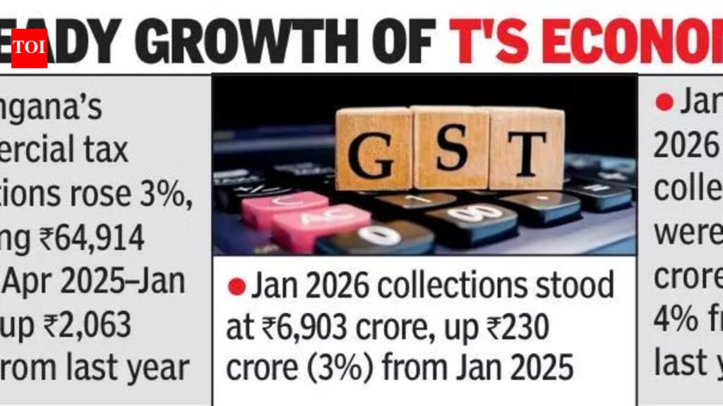 Hyderabad: Since the implementation of GST 2.0 last year, Telangana has recorded a 3% increase in commercial tax collections. Data shows that between April 2025 and Jan 2026, total collections reached 64,914 crore, compared to 62,851 crore during the same period last year, an increase of 2,063 crore. Official sources attribute this rise to steady growth of state’s economy.According to data available with TOI, commercial tax revenue in Jan 2026 stood at 6,903 crore, up from 6,673 crore in Jan 2025, reflecting a 3% growth and an increase of 230 crore. Meanwhile, GST collections for Jan this year amounted to 4,050 crore, compared to 3,907 crore a year earlier, registering a 4% growth and an uptick of 143 crore.VAT (petrol) collections dipped marginally to 1,444 crore from 1,453 crore, marking a 1% decline of 9 crore. In contrast, VAT (liquor) collections rose sharply to 1,341 crore from 1,236 crore, recording an impressive 8% growth and an increase of 105 crore. Profession tax, however, declined to 67 crore from 77 crore, representing a 13% drop and a decrease of 10 crore. For the cumulative period from April 2025 to Jan 2026, GST collections totalled 36,217 crore, compared to 35,418 crore during the corresponding period last year, indicating a 2% growth and an increase of 799 crore. VAT (petrol) collections during this period stood at 13,737 crore, up from 13,209 crore, reflecting a 4% growth and an increase of 528 crore.VAT (liquor) collections reached 14,163 crore, compared to 13,505 crore previously, marking a 5% growth, amounting to 658 crore. Profession tax collections increased, rising to 797 crore from 719 crore, registering an 11% growth and adding 78 crore to the total.