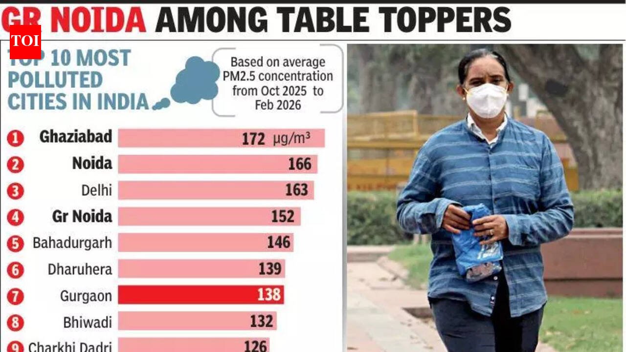 Gurgaon: Ghaziabad was India’s most polluted city during the last winter, followed by Noida and Delhi, according to a new analysis by Centre for Research on Energy and Clean Air (CREA). During this period, Ghaziabad recorded an average PM2.5 concentration of 172 micrograms per cubic metre, far above the national daily ambient air quality standard of 60 micrograms per cubic metre. Noida reported an average PM2.5 level of 166 micrograms per cubic metre.Delhi ranked third, with an average PM2.5 concentration of 163 micrograms per cubic metre. Based on average PM2.5 levels, the capital saw 18 ‘severe’ days, 87 ‘very poor’ days, 24 ‘poor’ days, 15 ‘moderate’ days, six ‘satisfactory days, and just one day in the ‘good’ category. Gurgaon ranked seventh among India’s 10 most-polluted cities in this winter, with PM2.5 levels exceeding three times the national safety standard, according to an analysis by Centre for Research on Energy and Clean Air (CREA). Four cities each from UP and Haryana ranked among the 10 most polluted, while Rajasthan had one city on the list, underscoring concentration of severe winter pollution across NCR.Using data from Continuous Ambient Air Quality Monitoring Stations (CAAQMS) for Oct 1, 2025 to Feb 28, 2026, the analysis reported a winter average PM2.5 concentration of 138 µg/m³ in Gurgaon, well above India’s National Ambient Air Quality Standard (NAAQS) of 40 µg/m³.Of the 151 days assessed, the city’s PM2.5 levels surpassed the national standard on 144 days, showing that air pollution remained above permissible limits for most of the season.The city recorded 31 ‘very poor’ days and three ‘severe’ days during the winter. It also saw 11 ‘moderate’ days, four ‘satisfactory’ days, and only three ‘good’ air quality days, indicating sustained exposure to unhealthy air.State-wise figures showed multiple Haryana cities with elevated winter averages. Bahadurgarh (146 µg/m³), Dharuhera (139 µg/m³), Sonipat (122 µg/m³), Manesar (121 µg/m³), Rohtak (109 µg/m³), and Ballabgarh (104 µg/m³). Faridabad averaged 91 µg/m³, while Karnal (87 µg/m³), Kurukshetra (84 µg/m³), Panchkula (79 µg/m³), Fatehabad (76 µg/m³), and Ambala (71 µg/m³) also remained well above the national limit.Nationwide, 204 of 238 cities analysed recorded winter average PM2.5 levels above the national standard, up from 173 during the winter. No city met the World Health Organization (WHO) guideline of 5 µg/m³.Across India, winter averages placed 19 cities in the ‘good’ category, 129 in ‘satisfactory’, and 65 in ‘moderate’. Another 13 cities recorded ‘poor’ air quality, and 12 fell into the ‘very poor’ category.“The comparison between the last two winters shows that widespread non-compliance continues, with more cities breaching the national standard in winter 2025–26 than in the previous winter,” said Manoj Kumar, India analyst at CREA.He said while Commission for Air Quality Management (CAQM) has set PM2.5 reduction targets for NCR, similar nationwide targets are needed, along with stronger controls on sulphur dioxide (SO₂), nitrogen dioxide (NO₂), and volatile organic compounds (VOCs), which contribute to secondary particulate pollution.