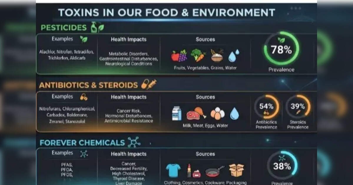 Experts warn that long-term accumulation of such substances may interfere with gut bacteria, digestion, immunity, metabolism and hormonal balance. Antibiotic residues may contribute to antimicrobial resistance, while pesticides and steroids are associated with endocrine and metabolic disturbances.