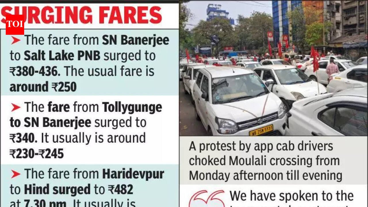 Kolkata: Traffic in vast parts of central Kolkata was severely disrupted for several hours on Monday after Citu-backed app cab drivers blocked the Moulali crossing, demanding that the govt fix a minimum fare of Rs 30 per kilometre for app-based cabs. They refused to move until their petition was accepted. Police said, around 12.10 pm, the protesters blocked the entire Moulali crossing. All traffic was shut on all sides for the next 30 minutes. Immediately after a few of them went to the transport department to submit a deputation but were reportedly refused, dozens of app cabs were positioned across the road, as around 70 drivers, along with their cabs, settled on the eastern flank of the crossing. It was not before 7.20 pm that they finally called off the agitation.The blockade effectively shut down SN Banerjee Road, with the police putting up barricades to stop them from reaching Esplanade, and slowed movement on AJC Bose Road from shortly after noon until late evening. The blockade led to buses taking long detours via Minto Park to try to reach Esplanade. Buses taking Amherst Street were affected too.The result was a massive surge in app cab prices around central Kolkata. The union’s flash protest, with CITU having around 2,000 app cabs under it, affected those travelling to and from the Sealdah-Esplanade belt.Sanjukta Banerjee, who was travelling from Rafi Ahmed Kidwai Road, was asked to fork out Rs 340 to reach Salt Lake. “I had to abandon my meeting with relatives as it was not possible for me at an advanced age to walk down to the Metro station,” said Banerjee.Commuters travelling from Sealdah and Entally towards Esplanade were among the worst affected. With vehicles unable to pass through the stretch, hundreds of daily passengers were seen walking long distances to reach Esplanade and the Chandni Chowk Metro station. Several office-goers and students reported delays as buses and taxis were unable to enter the area.Indranil Banerjee of the West Bengal Online Cab Operators’ Guild, another app cab union, said that while they support a fare structure, such claims as asking for a minimum Rs 30 fare per kilometre all through the day was “anti-people.” “We need the support of passengers. Hence, we have spoken to the transport department for introducing a scientific fare structure. The govt said it is ready to discuss the issue,” said Banerjee.A senior cop said personnel were deployed at the site to manage the situation and keep traffic moving on alternative routes, but congestion persisted through the afternoon.