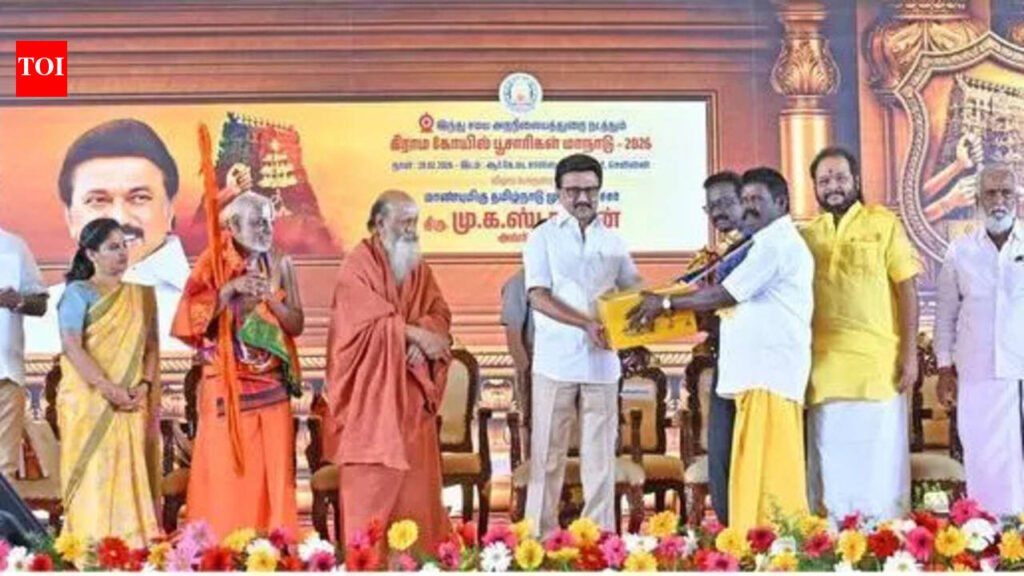 Chennai: Chief minister M K Stalin on Saturday said that true spiritualists and believers support a Dravidian model govt, one that follows the principle of “everything for everyone” and delivers it through schemes and programmes. He urged people to identify and reject divisive forces.“Seeing this conference, some may be astonished; a few may even be annoyed,” Stalin told a gathering of village temple priests at Kabaleeswarar Thidal in Chennai. The DMK govt’s objective, he said, is to celebrate equality and uphold everyone’s dignity and rights. This spirit, he added, should spread beyond Tamil Nadu to strengthen national unity. “Since we are doing this without compromise, spiritual leaders and believers continue to support this govt,” he said, stressing the need to reject those attempting to divide society. Recalling the widespread untouchability of earlier decades, Stalin said Tamil Nadu underwent a transformation where people from all sections can enter temples, become priests, and offer prayers in Tamil in the sanctum sanctorum. “This is true social transformation — and this is what true spiritualists wish for,” he said. On spirituality, Stalin said the DMK firmly follows party founder C N Annadurai’s principle, ‘Ondre Kulam, Oruvane Deivam’ (all are one; all gods are the same), and M Karunanidhi’s popular line that they were not against temples, but against turning them into havens for wrongdoers. “Guided by these principles, the Hindu Religious and Charitable Endowments department functioned to safeguard the rights and dignity of all,” he said. Taking a veiled dig at the previous AIADMK regime, he said people did not even know who the minister was then, adding that the situation is different now and praising HR&CE minister P K Sekarbabu. Listing the department’s achievements over the past five years, including consecration of 4,335 temples in 1,759 days, the appointment of 12 women Odhuvars, and 29 non-Brahmin priests, Stalin made 11 announcements for temple priests. These include new clothes for priests during Pongal, doubling compensation from 50,000 on a priest’s demise, and enhancing the annual salary ceiling to 1.25 lakh.