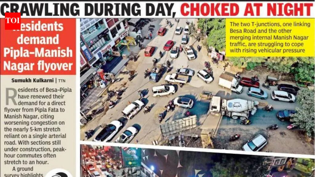 Nagpur: A chaotic web of criss-crossing vehicles, abrupt turns, and shrinking road space has turned the twin T-point stretch in Manish Nagar into one of the most frustrating traffic bottlenecks in Nagpur. Located barely 50 metres apart, the two T-junctions — one linking Besa Road and the other merging internal Manish Nagar traffic — are struggling to cope with rising vehicular pressure, leaving commuters stuck in long, disorderly queues. An aerial view of the junction reveals the scale of the problem: vehicles from multiple directions attempting simultaneous turns, two-wheelers squeezing through gaps, and heavy vehicles like trucks and cement mixers blocking entire lanes. The absence of lane discipline, coupled with haphazard roadside parking and encroachments, worsens the situation during peak hours.“It takes me nearly 20-25 minutes just to cross this stretch in the evening,” said Rohit Sharma, a daily commuter. “There’s no proper traffic management, and everyone is trying to move ahead at the same time.” Residents say the problem is not new, but it has intensified in recent months due to increasing population density and commercial activity in the area. Small vendors, roadside stalls, and parked vehicles have further narrowed the already constrained carriageway, leaving little room for smooth traffic flow.“The road is too narrow for the volume of traffic it handles,” said Neha Deshmukh, a local resident. “Even a single truck or tempo turning here creates a complete standstill. Authorities need to either widen the road or redesign the junction.” Officials from the traffic department acknowledge the challenge. Sources said the Ajni traffic division is responsible for a vast jurisdiction, making it difficult to station personnel at every congestion point throughout the day. Though constables are occasionally deployed at the junction, their presence is often limited to peak hours or special drives. “The twin T-point layout itself is flawed for current traffic levels,” said a senior traffic official on condition of anonymity. “Without structural changes or expansion, the problem will persist.”