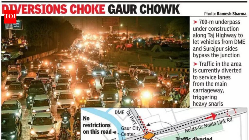 Noida: The 700-metre underpass running parallel to Taj Highway that is expected to decongest Gaur Chowk, among Greater Noida West’s busiest stretches, is likely to open by June. Greater Noida Industrial Development Authority (GNIDA) chief executive officer Sumit Yadav said about 65% of the work has been completed.“In Sept last year, the slab of the underpass was completed, and traffic movement was allowed without restrictions for vehicles travelling from Parthala Chowk to Gaur Chowk and further towards Ek Murti Chowk,” Yadav said. “We expect to complete the remaining work in the next three to four months and aim to open it before the monsoon. This will significantly improve traffic movement at Gaur Chowk.”Dotted with several housing societies and malls, Gaur Chowk remains knotted with snarls as traffic from Noida, Surajpur, Crossings Republik, and Delhi-Meerut Expressway converges at the intersection. During peak office hours, tailbacks extend up to Parthala flyover. Once ready, the Rs 92-crore six-lane underpass will allow vehicles coming from or headed to Surajpur to bypass the daily bottlenecks at Gaur Chowk by connecting Greater Noida directly with Gaur City and DME ahead.Currently, traffic has been diverted from the main carriageway to service lanes on both sides of the Taj Highway, leading to heavy congestion during peak hours. There are no curbs on Vikas Marg, which intersects the highway at the intersection. Commuters claimed the ongoing construction has made the junction difficult to navigate. Rakesh Kumar said traffic from the three-lane carriageway is abruptly diverted into a service lane near Gaur Chowk. “It can take nearly half an hour to cross the area during rush hour,” he said.Amit Kumar, a resident of Noida’s Sector 121, who frequently travels between Noida and Greater Noida West, said the narrowed lanes cannot handle the volume of traffic. “Vehicles remain stuck for long stretches. Even two-wheelers find it hard to move. Autos, e-rickshaws and food carts also occupy the roadside,” he said.Work on the project began in June 2024 with an initial completion timeline of 18 months.