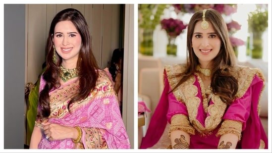 Saaniya chose a pink Bandhani saree, a traditional tie-dye textile that originates from western India and is widely worn during wedding ceremonies. The saree features classic Bandhani dot patterns across the body in a rich pink hue. What elevates the piece is the ornate embroidered border, crafted with intricate zari and multicoloured threadwork motifs. The border adds a regal, heirloom-like touch while complementing the celebratory vibe of a mehendi function.