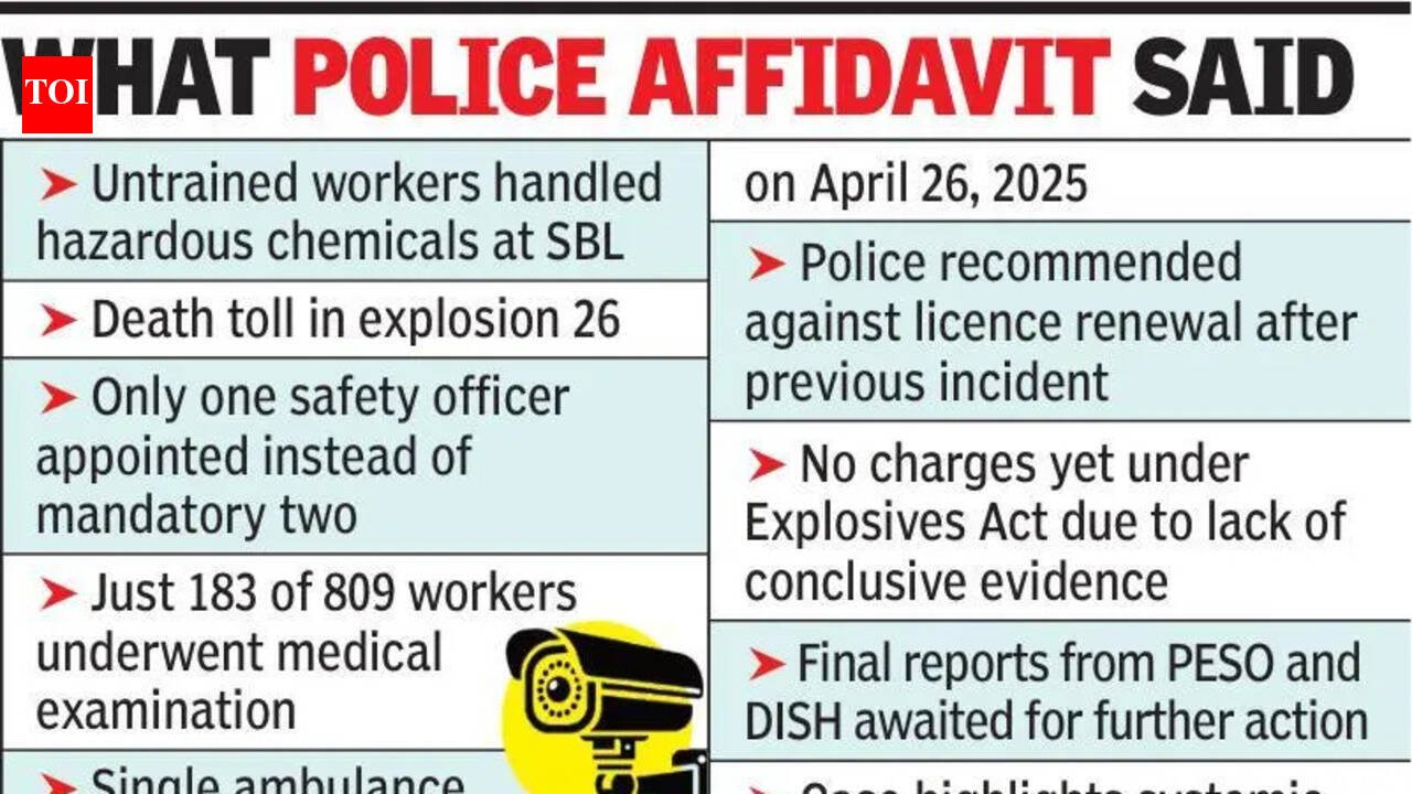 Nagpur: Inexperienced and unskilled workers handled hazardous chemicals at SBL Energy Ltd at Raulgaon (Katol taluka), where a powerful explosion claimed 26 lives in March, the Nagpur Rural Police told the Nagpur bench of the Bombay High Court. These workers were assigned critical operational roles, said police adding that investigators have drawn a preliminary link between serious lapses in industrial safety compliance and the explosion.A division bench comprising Justices Anil Kilor and Raj Wakode is hearing a public interest litigation filed by social activist Jammu Anand. In the affidavit submitted on Wednesday, superintendent of police (Rural) Harssh Poddar detailed multiple violations at the company.The affidavit revealed that the company failed to appoint the mandated two qualified safety officers and two medical officers, employing only one safety officer for a workforce of 809. “Only 183 employees had undergone medical examination,” the police said, adding that just a single ambulance was available and no CCTV system had been installed in the production unit.The incident resulted in the immediate death of 17 women workers on March 1 this year, with the toll rising to 26 during treatment. The court was also informed that a similar explosion occurred at the same facility on April 26, 2025, after which police recommended against renewal of the company’s licence. But operations continued, said police.Petitioner’s counsel Arvind Waghmare raised concerns over the “absence” of criminal charges against the company’s directors or owners. Responding to this, the police stated that “sufficient evidence is not yet available to invoke provisions under the Explosives Act, 1908,” and that further action would depend on final reports from the Petroleum and Explosives Safety Organisation and the Directorate of Industrial Safety and Health.Appearing for the state, additional govt pleader Kalyani Marpakwar informed the court that investigations are ongoing, with regulatory findings expected to shape the next course of legal action.# WHAT POLICE AFFIDAVIT SAIDUntrained workers handled hazardous chemicals at SBLDeath toll in explosion 26Only one safety officer appointed instead of mandatory twoJust 183 of 809 workers underwent medical examinationSingle ambulance and no CCTV in production unit Similar blast reported earlier on April 26, 2025Police recommended against licence renewal after previous incidentNo charges yet under Explosives Act due to lack of conclusive evidenceFinal reports from PESO and DISH awaited for further actionCase highlights systemic industrial safety failures and regulatory gaps