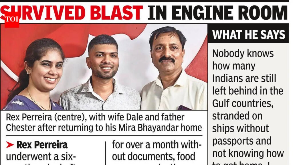 ‘Bombs fell near ship’: Stranded sailor back home | page 1A 28-year-old merchant sailor from Mira Bhayandar, Rex Perreira, who left for Dubai in Oct, got stuck in the war zone after he was, without a formal contract, directed to Iraq. “Bombs fell near and around the ship, causing vibrations,” he said a day after returning home, narrating how he was cut off from communication, and surrounded by the distant thud of bombs. “The captain abandoned the ship. We were 4 four Indians left in charge,” he said. Was stuck on vessel for over one month as bombs fell nearby: Sailor | page 3Mumbai: For more than a month, Rex Perreira (28), a merchant sailor from Mira Bhayandar, lived through a nightmare at sea – stranded without documents, cut off from communication, and surrounded by the distant thud of bombs. “The bombs fell near and around the ship, causing vibrations across it. One landed barely 5 km away,” Perreira said a day after returning to Mumbai on Tuesday.What began as a routine assignment in Dubai in Oct 2025 quickly changed into something else. Sent by an agent for internal work aboard a supply vessel, Diva, Perreira said he was moved to Sharjah in weeks and, without a formal contract, directed onward to Iraq. “The moment we reached the border, the captain abandoned the ship. We were just four Indians left in charge,” he said.In a near-fatal incident before the war started, just off Basra port, Perreira said the ship’s engine room, where he’d been posted despite assurances of a steering role, exploded due to a mechanical error. “I was told I’d be given steering duty but was made to work in the engine room. The engine had overheated, and we warned deck officers not to restart it. They tried many times anyway. When they tried again without informing us, it exploded. I sustained minor burns, and the engine room was destroyed,” he said.The vessel itself, he added, was in a dire state. “It was practically a scrap ship – no WiFi, no reliable generators, engine failures, no supplies. We were hungry for a couple of days. We had to cook using diesel and gas on an oil tanker, which is risky,” he said. With no communication except fleeting cellular signals and a patchy VHF radio, even reaching authorities was hard.By Feb 17, the vessel had reached Basra port in Iraq, where the crew found themselves stranded without passports or continuous discharge certificates, essential for any sailor. “We couldn’t disembark even if we wanted to. We had no documents, no contract, nothing to prove why we were there,” he said.Between March 2 and April 5, during the war, Pereira stayed stuck at Basra port even as tensions escalated. “March 9, 10 and 11 were the most intense, with continuous explosions,” he said. “There were many ships stranded alongside us, and each will have 2-3 Indians working on it.”Appeals to the Indian embassy initially yielded little due to lack of documentation. “We kept calling, requesting assistance, but without papers, there was little they could do,” Perreira said. It was only after sustained efforts that emergency letters were issued, enabling visas for Saudi Arabia and Kuwait. Back home, each passing hour without contact deepened anxiety. “If we didn’t hear from him every hour, we’d start worrying,” said his father, Chester Perreira, a retired shipbuilder who served over four decades with the defence ministry.The escape was just as arduous. After finally receiving his documents on April 1, Perreira travelled by road towards the Safwan border. With no official transport available, he relied on the kindness of strangers. “Some Indians near the border helped me onto a bus to Saudi,” he said. From there, a 17-hour journey to Riyadh followed, before he could board a flight home. “I landed in Mumbai at 3 pm Tuesday,” he said. A source from the directorate general of shipping told TOI that the licence of the Goa-based shipping agency, Ouvert Marine Solutions Pvt Ltd, which had hired Perreira, has since been suspended.Calling the episode symptomatic of a larger problem, Manoj Yadav, general secretary of Forward Seamen’s Union of India, said, “These agents who try to recruit sailors run an interconnected, highly advanced racket.” He added 42 vessels carrying Indian sailors remain stuck at Iranian ports. (Inputs by V Narayan)