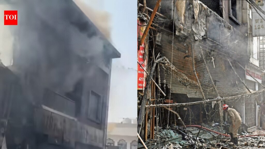 NEW DELHI: A deadly inferno tore through a residential-cum-commercial building in southwest Delhi’s Palam area on Wednesday morning, claiming the lives of nine family members, including three children. Three residents jumped from the top floors and are now battling for life at hospital.The fire was likely sparked by a short circuit on the ground floor, an initial probe suggested. A detailed investigation involving police, fire dept and govt is on. The building was owned by businessman and Sadhnagar market association president Rajender Kashyap (70), who had gone to Goa for work two days prior to the incident. He returned on Wednesday to find his family members dead.
