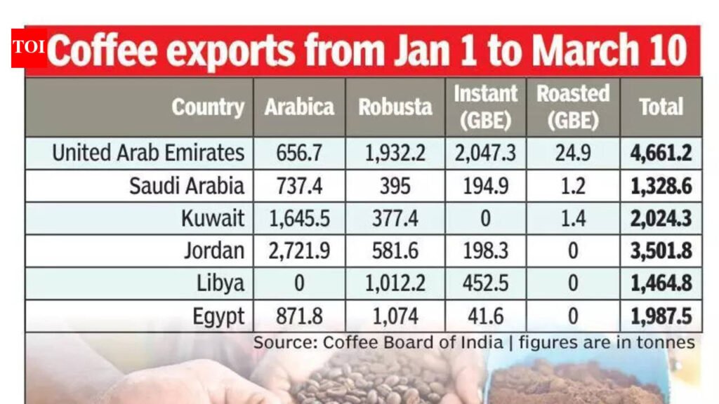 Mangaluru: Karnataka’s coastal coffee export hub is facing disruption due to the West Asia crisis, with shipments to Gulf countries delayed and freight costs rising sharply.Exporters in Mangaluru said cargo bound for the Gulf countries, usually routed through Jebel Ali Port, has been put on hold following the crisis. The freight cost for a 20-ton container to Jebel Ali Port has risen from about $578 to $3,800, while shipments via Shuwaikh Port have increased from $850 to $4,500.Ganesh Chakrapani, a major coffee exporter from Mangaluru, said the closure of the UAE port has forced exporters to look at alternatives such as Sohar Port in Oman. Under the revised arrangement, coffee is shipped to Sohar and then transported by road to Gulf countries, and the freight charges shot up sixfold, Chakrapani said.New Mangalore Port Authority accounts for about 90% of India’s coffee exports, while Cochin in Kerala handles around 8% and Mumbai about 2%. Chakrapani said overall, West Asia and neighbouring countries accounted for 30% to 35% of India’s total coffee exports. The region mainly exports Arabica coffee in large volumes to Gulf markets, along with other varieties, including Robusta, instant coffee, and Monsooned Malabar coffee produced in coastal Karnataka. According to the Coffee Board of India data, the UAE remained the largest Gulf importer with 4,661 tonnes, supported by strong demand for instant coffee of more than 2,000 tonnes. Jordan imported 3,501 tonnes, mainly Arabica, while Kuwait imported 1,645 tonnes, also largely Arabica. Saudi Arabia imported 1,328 tonnes, with demand spread across varieties. Libya and Egypt were also significant buyers, with Libya showing stronger demand for Robusta and Egypt importing both Arabica and Robusta.Between Jan 1 and March 10, these countries together imported 14,965 tonnes of coffee from India. The variety-wise breakdown stood at 6,633 tonnes of Arabica, 5,373 tonnes of Robusta, 2,935 tonnes of instant coffee, and 28 tonnes of roasted coffee. Exporters said the crisis also pushed up coffee prices.