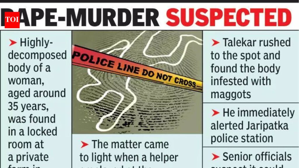 Nagpur: A highly-decomposed body of a woman, aged around 35 years, was found in a locked room at a private farm in Nara Vasti, Jaripatka area of north Nagpur, on Sunday morning sparking suspicions of foul play, possibly rape and murder. The matter came to light around 7am when Sonu alias Golu Jibhe (30), a helper employed at the farm for the past 10 years, informed the owner Moreshwar Talekar (63), a resident of Nara Vasti, about spotting half-naked body of a woman in room No. 4.A part of the seven-acre farm is leased for a brick kiln while five rooms are used for storing cattle fodder, with some occupied by tenants. Talekar rushed to the spot and found the body infested with maggots, indicating significant decomposition.The owner immediately alerted Jaripatka police station. Police officers documented the scene and shifted the body to Mayo Hospital for autopsy and further procedures. Police have initially registered accidental death in the matter.Zonal DCP Sandeep Pakhale said the body seem to be wrapped in a traditional attire, such as a saree. “The body decomposed to such an extent that visible injuries were obliterated. The autopsy will determine the exact cause of death,” Pakhale said, adding that police have some leads regarding the woman’s identification.Preliminary investigation suggests that the woman died four days ago, possibly during Holi. Senior officials suspect it could be a case of rape and murder. “We suspect she had a companion who spent time with her in the isolated storeroom before her death,” a source said adding, the farm’s isolated location, with broken doors in some rooms and limited regular oversight, raised questions about how the woman ended up there.Cops are questioning the servant, tenants, and landowner while examining CCTV footage (if any) and forensic evidence.