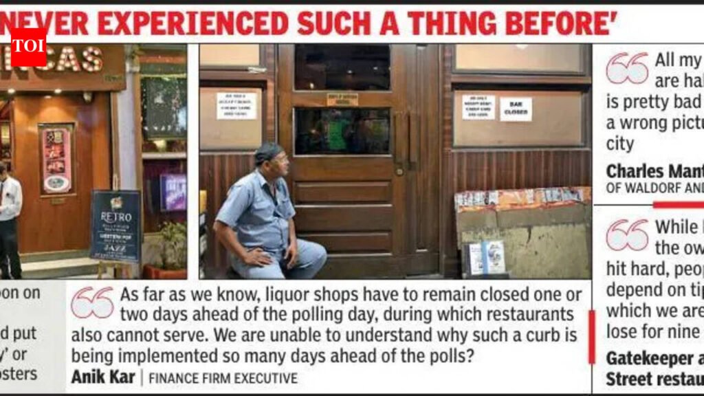 Kolkata: Park Street fell silent on Monday as people coming in to the restro-bars thinned out after the curb on liquor ahead of the state assembly poll. By late afternoon, most restaurants had put up the ‘Dry Day’ or ‘Bar Closed’ posters. Many who visit their favourite joint on Park Street for a drink or two before heading home from office were not pleased with this ‘sudden’ ban on liquor when there are nine more days ahead for the city to go to the polls. Even other visitors who were on Park Street on work with no intention of grabbing a bite and drink were wondering why the ‘Dry Day’ posters were put up so many days ahead of the polls. Kolkata goes to the polls on April 29. “As far as we know, liquor shops have to remain closed one or two days ahead of the polling day, during which restaurants also cannot serve. We are unable to understand why such curb is being implemented so many days ahead of the polls?” wondered Anik Kar. The finance firm executive came to Olypub along with two colleagues after office only to be told that the bar is closed till further notice.“While this measure could be to curb streaks of violence by some under the influence of alcohol, how is it being implemented in Kolkata now whereas the first phase of elections is in the districts?” said Manish Ranjan, who came to a restaurant with a friend. Friends Ketan Gaurav and Indrani Mondal, who came all the way for some work from Kalyani, were to catch up with friends in a Park Street restaurant. The duo said they came to know about the prohibition only upon reaching Park Street. “If there is a prohibition, we will be meeting over some food,” said the duo.Monday started as a usual day even for managers, bar tenders and other staff members for the restaurants lined up along Park Street. They were also taken aback when they were informed to put up the ‘Bar Closed’ notices. “While the business for the owners will be hit hard, people like us depend on tips largely, which we are likely to lose for nine to 10 days in this unprecedentedly long prohibition,” said a gatekeeper at one of the restaurants. Restaurant managers said that even as the footfall remains low on the beginning day of the week, it was all the more thinner on Monday. Even as places like Trincas had its live band on, TOI found just four clients spread over two tables. Whether it was Bar-B-Q, Oasis, Mocambo or Tung Fong, the scene was the same. “We got the notification only in the late afternoon. All my restaurants are half-empty. It is pretty bad, and it sends a wrong picture for our city. I have never experienced such a thing before,” said Charles Mantosh, owner of Waldorf and Floriana.